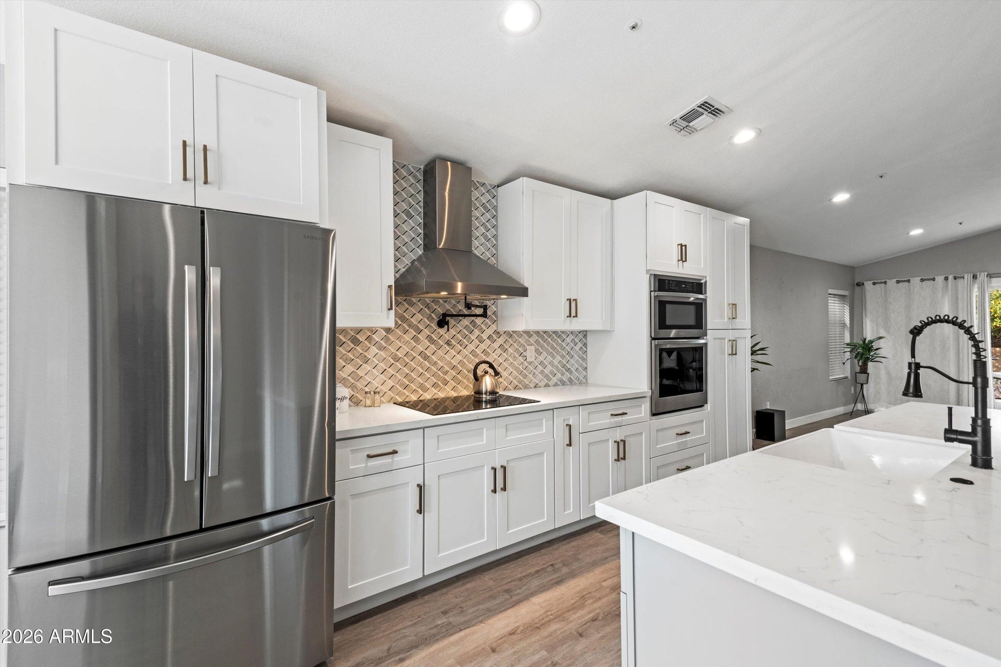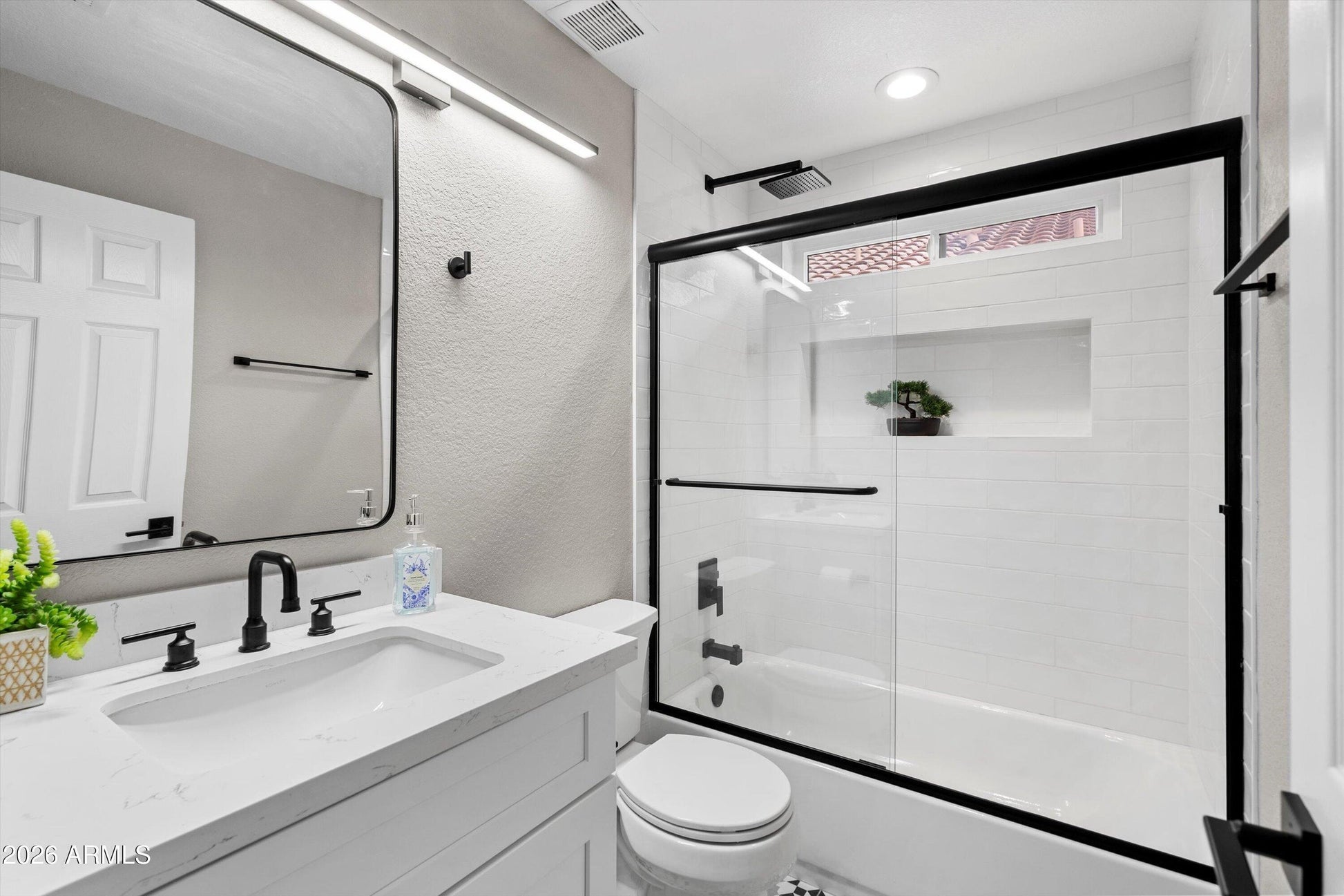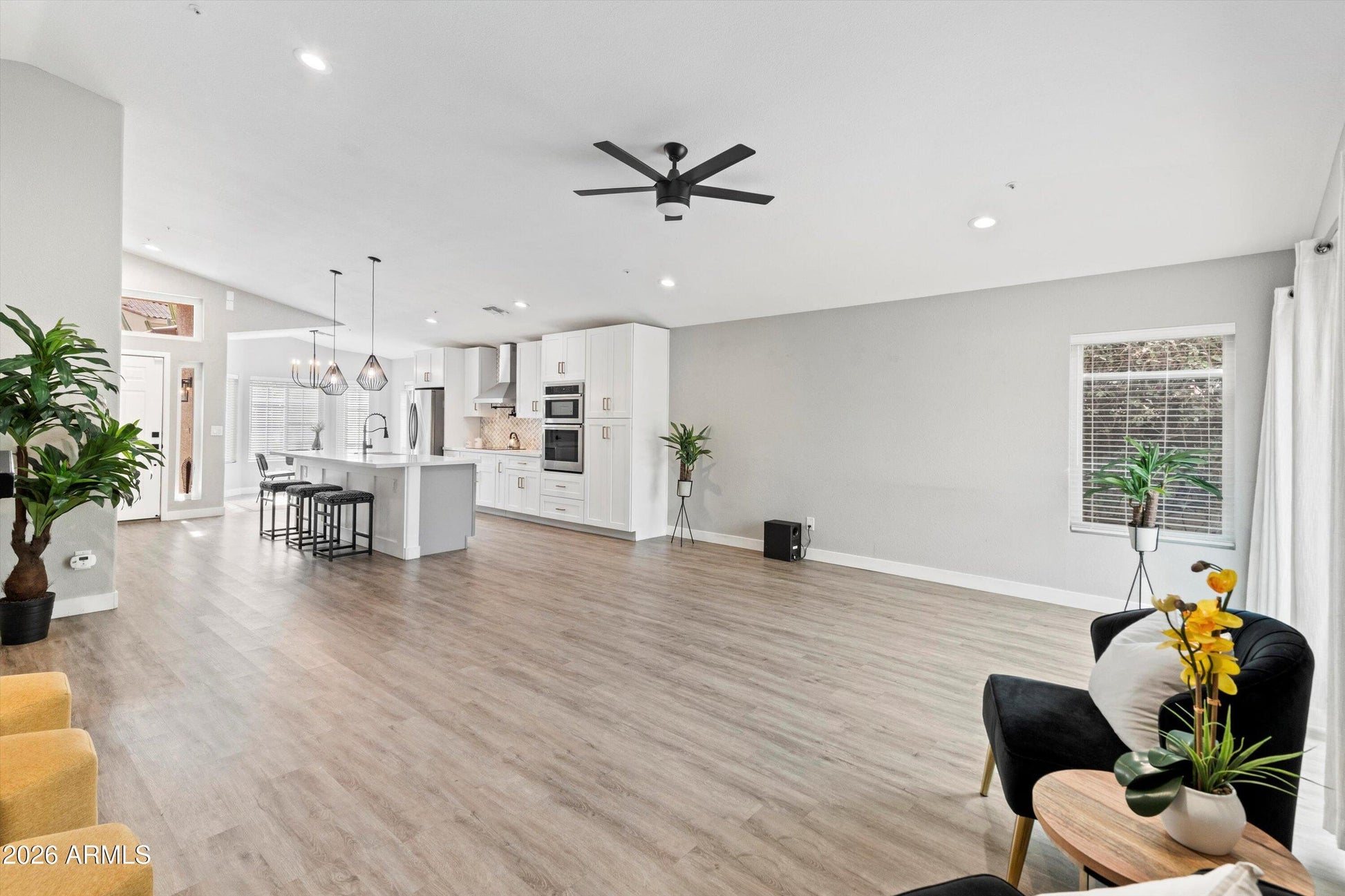 Fall in love with this fully remodeled home in the highly sought-after gated community of Premiere at Pinnacle Peak. This move-in ready 3-bedroom, 2-bath home offers a 2-car garage and a prime location near stunning mountain preserves, premier shopping, dining and entertainment. Designed for entertaining, the home features soaring ceilings, integrated LED lighting and fans and a remote-controlled LED fireplace wrapped in custom tile. The open kitchen showcases white and gray shaker cabinets with soft-close hardware, stainless steel Samsung appliances, a white porcelain farmhouse sink and a massive quartz island with breakfast bar seating and abundant storage. Every detail has been modernized, including luxury vinyl plank flooring throughout and beautifully remodeled bathrooms with dual vanities, contemporary mosaic tile and a spacious dual frameless walk-in shower. Step outside through oversized sliding doors to your private desert oasis with premium synthetic grass, granite rock accents, mature trees, LED lighting and an automated drip irrigation system. Located in one of the state's top school districts, this standout home won't last long.